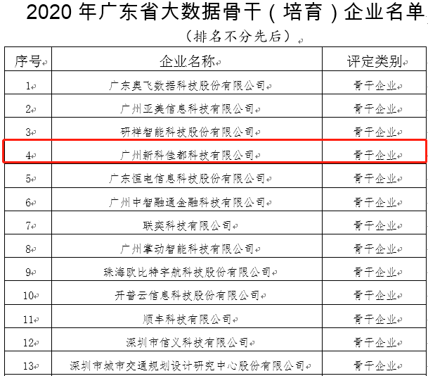 11月23日,廣東省工業和信息化廳發布了關于2020年廣東省大數據、人工智能骨干(培育)企業名單的公示。佳都科技憑借著突出的人工智能創新能力和產業帶動作用,入選2020年廣東省人工智能骨干企業名單,同時,佳都科技控股子公司方緯科技、參股公司云從科技入選該名單,佳都科技全資子公司新科佳都入選2020年廣東省大數據骨干企業名單。