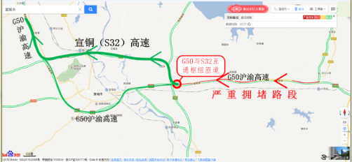擁堵的源頭位于安徽省宣城市G50滬渝高速與S32宣銅高速的互通樞紐匝道口處。往蕪湖、合肥方向的大部分車輛選擇在此離開G50高速,取道只有一條車道的匝道前往S32高速,繼續前行23公里后,再次回到G50高速繼續北上蕪湖、合肥。其實,直行G50與繞行S32均能到達目的地。