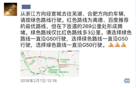 4、利用互聯網、微信、微博發布路況信息,引導往蕪湖、合肥車輛沿G50滬渝高速繼續行駛。