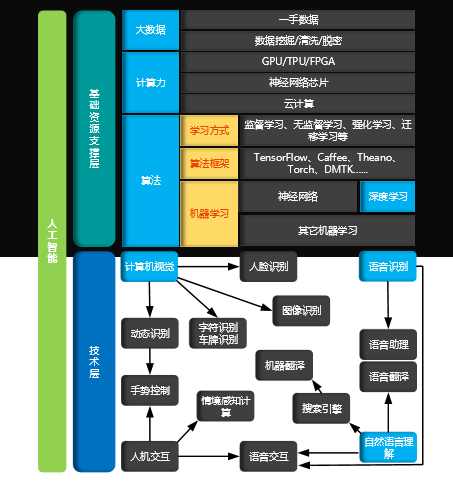 1、 人工智能生態格局三層架構,包括基礎資源支持層,AI技術層和AI應用層?;A資源支持層主要包括人工智能核心處理芯片和大數據,是支撐技術層的圖像識別、語音識別等人工智能算法的基石。核心處理芯片和大數據,成為支撐人工智能技術發展的關鍵要素。AI技術層通過不同類型的算法建立模型,形成有效的可供應用的AI技術。AI應用層,則是利用中層輸出的AI技術為用戶提供智能化的產品和服務。