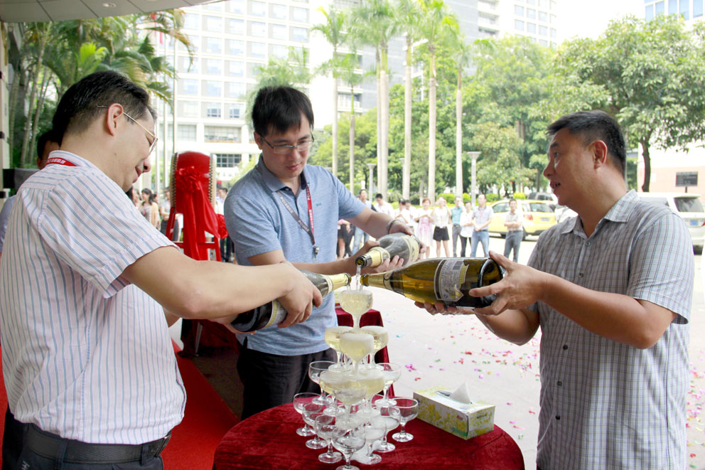 在慶功典禮上,董事長劉偉,副總裁顧友良,助理總裁、智能安防(廣東)事業(yè)部總經(jīng)理劉斌共同開啟香檳慶祝