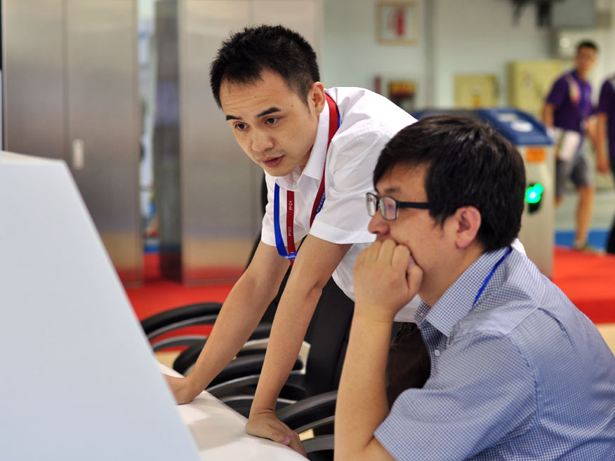 參觀者仔細聆聽技術人員講解綜合監控系統